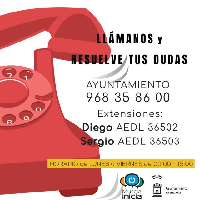 El Centro de Iniciativas Municipales ‘Murcia Inicia' continúa prestando a usuarios e interesados atención telefónica de lunes a viernes, en horario de 09.00 a 15.00 horas, a través del teléfono 968358600 (Extensiones 36502 y 36503) y del correo electrónico agentesdesarrollo@ayto-murcia.es.