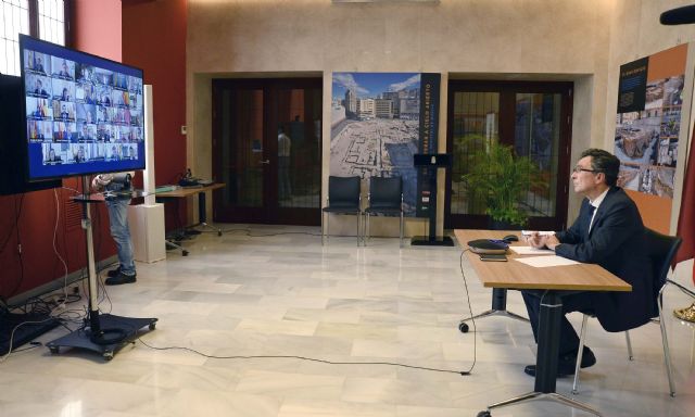 El alcalde de Murcia, José Ballesta, mantuvo una reunión esta mañana con el presidente del Gobierno, Pedro Sánchez, en la que participaron también los alcaldes de la Junta Directiva de la Federación Española de Municipios y Provincias (FEMP), con motivo de la crisis sanitaria y socioeconómica generada por la pandemia mundial del COVID-19.