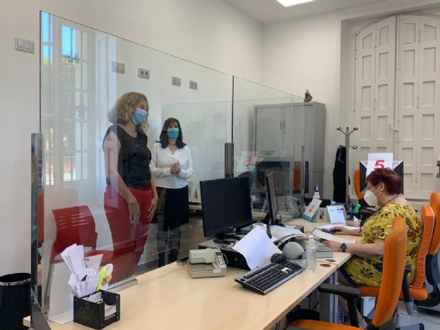 La concejala Mercedes Bernabé ha visitado esta mañana las instalaciones de Ventanilla Única, en Glorieta de España, donde ya se han instalado cinco mamparas de seguridad para los puestos de atención presencial y se han señalado las entradas, salidas y sala de espera con indicadores que recuerden la importancia de guardar el distanciamiento físico.