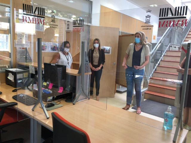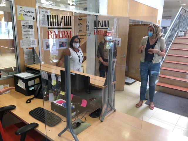 La concejala de Agenda Urbana y Gobierno Abierto, Mercedes Bernabé, ha visitado la Biblioteca Cabezo de Torres para comprobar los trabajos de instalación de mamparas que se está llevando a cabo en el Servicio de Información y Préstamo.