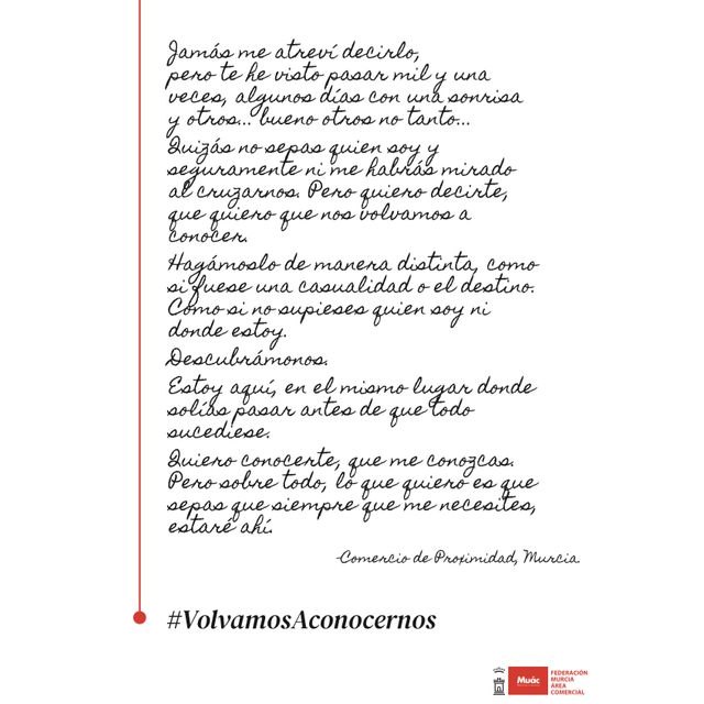 La campaña se promocionará en los medios de comunicación más representativos y las redes sociales de Muác, con un llamamiento en tono emocional, y en palabras de un “admirador secreto”, el comerciante, diciéndoles a sus clientes, “QUIERO CONOCERTE Y QUE ME CONOZCAS”. hacia sus clientes. El concejal de comercio del consistorio, Juan Fernando Hernández, ha hecho en la presentación un “llamamiento a todos los ciudadanos del municipio a colaborar con la difusión de la campaña, para que llegue a cada rincón de Murcia y a ayudar a este castigado sector, a avanzar, haciendo nuestras compras cotidianas en los comercios de nuestros barrios o pedanías, promoviendo el consumo”. Todos los formatos de comunicación de la campaña estarán disponibles en las RRSS de Muác.