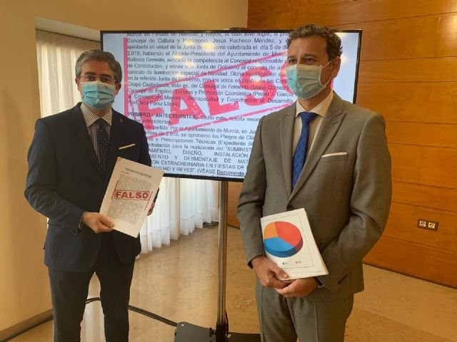 El concejal de Cultura y Recuperación del Patrimonio, Jesús Pacheco, y el edil de Pedanías y Barrios, Marco Antonio Fernández, han aseverado que los contratos de iluminación del Ayuntamiento de Murcia cuentan con todos los informes favorables de los Servicios Jurídicos, Intervención y Contratación, este último organismo dependiente de la Concejalía de Fomento.