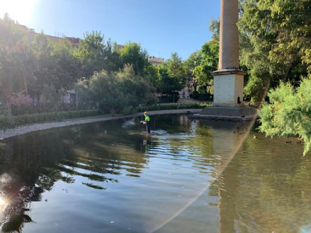 "Los tratamientos del agua en los lagos y fuentes tienen como objetivo mantener el nivel óptimo de calidad para los vecinos y visitantes que las contemplan a diario, así como para los animales que los habitan. Nuestro compromiso es que los murcianos puedan disfrutar al aire libre de las zonas verdes del municipio, ya que son espacios seguros, de encuentro entre vecinos y amables para todos", explica José Guillén
