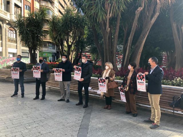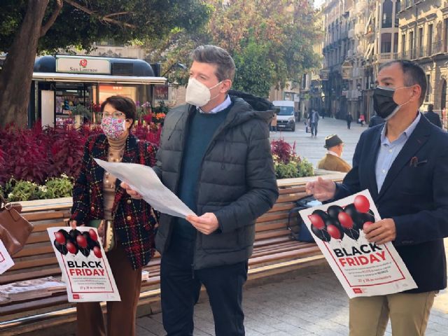 El concejal de Comercio, Mercados y Vía Pública, Juan Fernando Hernández, ha presentado esta mañana, acompañado del presidente de Federación Murcia Área Comercial (Femuac), Santiago Vera; y de miembros de diferentes asociaciones de comerciantes del municipio, la campaña de promoción y descuentos en torno al ‘Black Friday', que arranca este viernes 27 de noviembre y continuará el sábado 28.