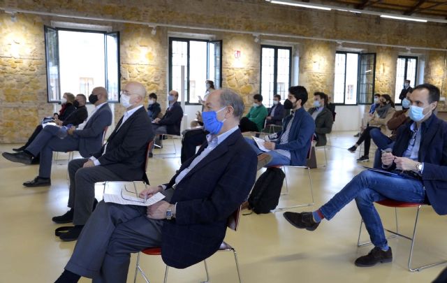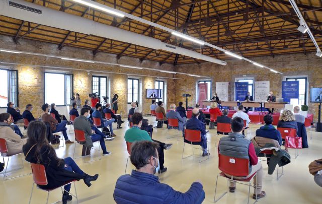 El alcalde de Murcia, José Ballesta, junto a los ediles de Desarrollo Sostenible y Huerta, Antonio Navarro, y Agenda Urbana y Gobierno Abierto, Mercedes Bernabé, y la presidenta del Colegio Oficial de Arquitectos de Murcia (COAMUR), María José Peñalver, ha inaugurado el acto que se ha seguido de manera presencial, con un aforo máximo de 36 personas, y online, a través del canal de YouTube del Ayuntamiento.