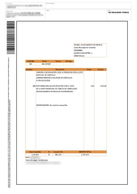 El Grupo Municipal Socialista ha lamentado en varias ocasiones que los presidentes de las juntas municipales no puedan adquirir y repartir mascarillas entre sus vecinos y vecinas, sin embargo, esta mañana "hemos comprobado que el alcalde pedáneo de Cobatillas, Francisco Fenoll, también trabajador de la Oficina Smart City, ha facturado 600 portamascarillas, que realmente son bolsas de plástico, por 2.795,10 euros, los cuales fueron repartidos ayer entre los escolares junto a unas mascarillas con luces. Si los alcaldes pedáneos no pueden comprar mascarillas, según instrucciones de la Concejalía de Descentralización, de dónde han salido las que ha distribuido", pregunta la concejala socialista Ainhoa Sánchez.