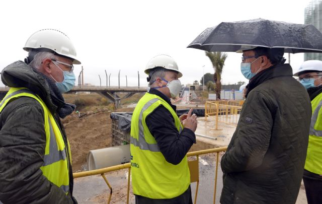 El alcalde de Murcia, José Ballesta, junto al concejal de Desarrollo Sostenible y Huerta, Antonio Navarro, el edil de Pedanías y Barrios, Marco Antonio Fernández, visitó esta mañana las obras que se están llevando a cabo en Puente Tocinos, junto a la mota del río Segura, a la altura de la avenida Miguel Induráin, donde se está construyendo un nuevo colector que evitará inundaciones en casos de lluvias intensas y que dotará al sistema de alcantarillado de un mayor grado de flexibilidad –evitando desbordamientos puntuales en puntos críticos de la red de colectores–.
