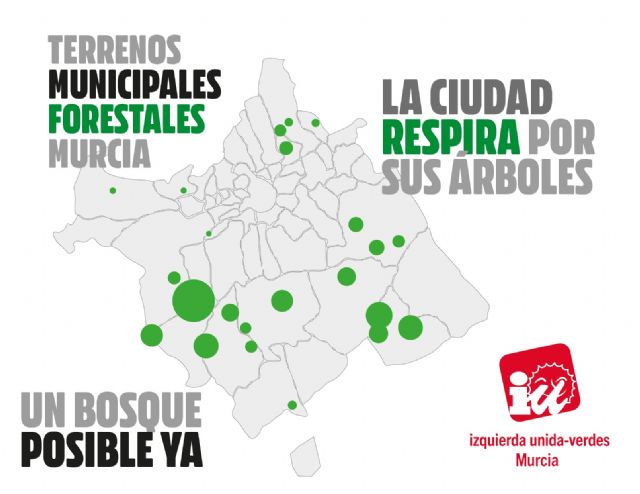 IU-Verdes Municipio de Murcia recuerda al ayuntamiento que dispone de 2600 hectáreas de terreno municipal ubicadas en suelo forestal, cuyo uso con especies adecuadas, supondría un aumento considerable de la masa forestal que repercutiría en una captura significativa de CO2.