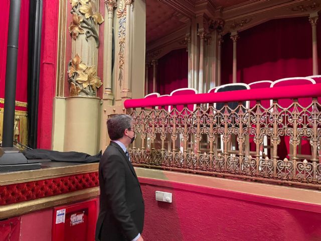 El concejal de Cultura y Recuperación del Patrimonio, Jesús Pacheco, ha visitado esta mañana el Teatro Romea donde se ha remodelado una butaca del palco 10 de platea que nunca se ocupa para evitar que se cumpla la leyenda que vaticina que el teatro se incendiará cuando esté todo el aforo completo.