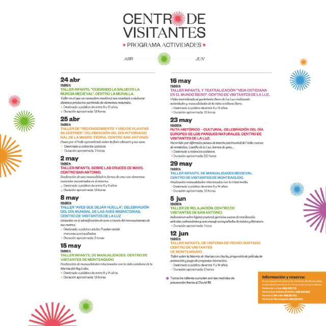 Los Centros de Visitantes de La Luz, San Antonio El Pobre, La Muralla y Monteagudo han programado para los próximos meses un total de diez actividades de temática diversa en la que predominará el contacto con el entorno natural y el conocimiento de la Historia. Dirigidas a públicos de todas las edades, tendrán plazas limitadas que oscilarán entre las 10 y las 15 personas.
