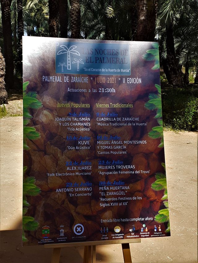 El pasado 5 de junio de 2021 tuvo lugar en el Palmeral de la pedanía murciana Zaraíche, en la plena Huerta de Murcia, la presentación el ciclo Las Noches de El Palmeral. “En el Corazón de la Huerta de Murcia”, una iniciativa estival que cuenta ya con su segunda edición, avalada por la Junta Municipal de Santiago y Zaraíche, el Ayuntamiento de Murcia y Enclave Cultura, cuyo objetivo es traer músicas a un entorno privilegiado y huertano como es el del Palmeral, donde melodía y sonidos naturales se fusionan creando un maridaje cultural genuinos.