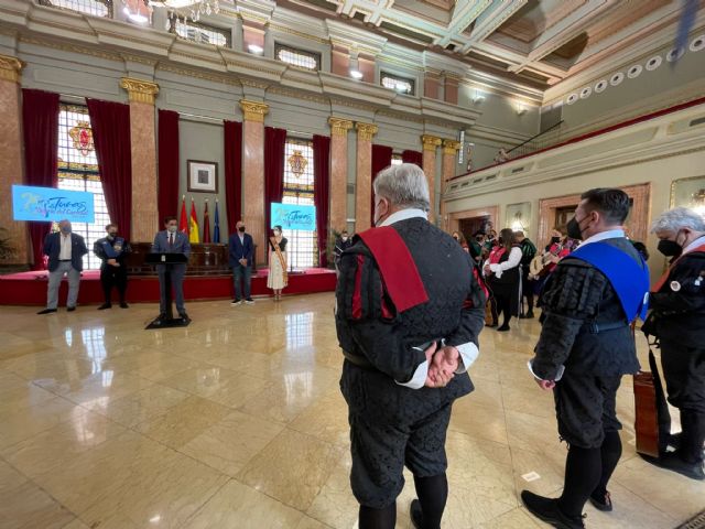 Durante el acto, celebrado este viernes en el Salón de Plenos, Carlos Molina, director del certamen, le ha hecho entrega de una réplica de la pandereta (imagen del evento) a la Madrina de 2021, la Reina de la Huerta, María Teresa Irles; al Gran Maestre, el actor Julio Navarro; al concejal de Cultura, Pedro García Rex y al alcalde, José Antonio Serrano.