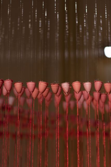 La instalación propuesta está compuesta por más de trescientas copas menstruales en porcelana atomizada tintada con distintas intensidades de rojo, que han sido conformadas a partir del molde en escayola de una copa de silicona real. De ellas caen hilos de color rojo que, a modo de flujo sanguíneo, se derrama como una lluvia sobre un suelo cubierto de semillas y tierra.