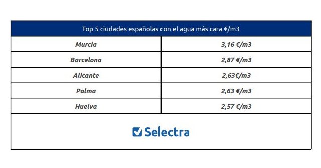 En el lado opuesto encontramos a la ciudad de Murcia, que posee el agua más cara de todo el territorio nacional con 3,16 €/m3, es decir, más de dos euros más cara que la palentina. A Murcia le siguen algo más lejos Barcelona -2,87€/m3- y Alicante, con 2,63 €/m3 empatada con Palma de Mallorca.