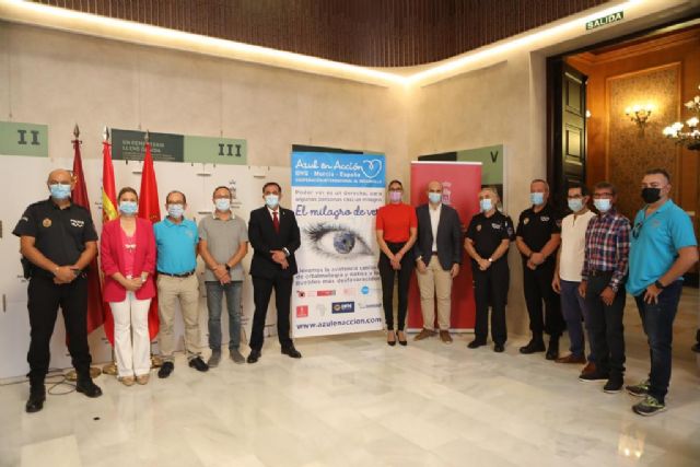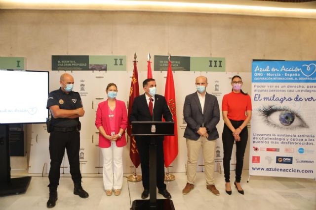 El Alcalde, José Antonio Serrano, acompañado por Jesús Franco, presidente de la ONGD Azul en Acción, y los concejales Paqui Pérez, Enrique Lorca y Teresa Franco, ha presentado esta mañana una nueva edición de la campaña de intervención en oftalmología y óptica ‘El milagro de ver', que esta ONG, creada en el seno de la Policía Local de Murcia, desarrollará en Senegal.