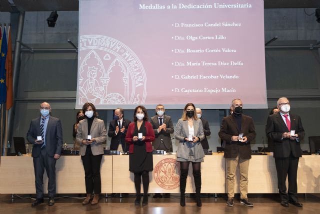 La Universidad de Murcia ha vivido una mañana de reconocimiento y homenaje a la dedicación universitaria de 152 miembros de la comunidad universitaria que llevan toda una vida trabajando por la institución. Ha sido en un gran acto celebrado en el salón de actos de la Facultad de Economía y Empresa, en el Campus de Espinardo, durante el que se ha hecho entrega de las Medallas a la Dedicación Universitaria a personal de administración y profesorado que lleva 25 años de servicio y en el que también se ha rendido tributo a quienes se jubilaron durante el pasado curso.