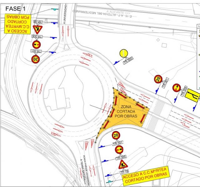 La concejalía de Fomento, Infraestructuras y Contratación informa que, con motivo de las obras del proyecto de Infraestructura de obra civil para el soterramiento parcial de la LAT 132kv, la salida hacia el Centro Comercial Myrtea desde la rotonda de la Costera Norte, con salidas a Terra Natura y el Campus de Espinardo, estará cerrado al tráfico desde hoy 15 de febrero, hasta el 11 de marzo a las 18:00 horas.