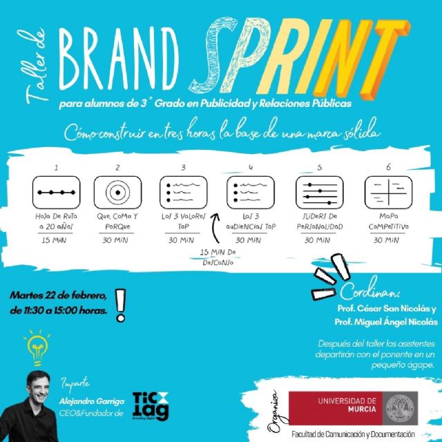 La facultad de Comunicación y Documentación de la Universidad de Murcia organiza este martes, 22 de febrero, el taller 'Brand Sprint' sobre cómo construir las bases de una marca sólida en tres horas, que tendrá lugar de horario de 11.30 a 15 horas en el Edificio Aured, donde se ubica el plató de televisión de la UMU.