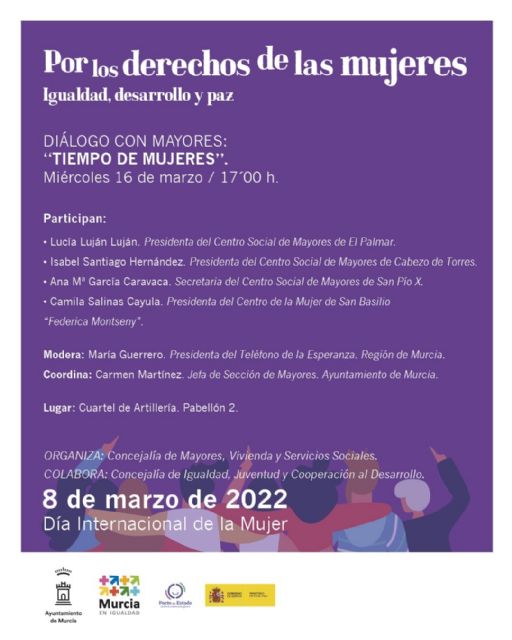 Por su parte, la concejala Paqui Pérez mostrará, una vez más, su agradecimiento a todas las personas que han hecho posible que se celebre este segundo encuentro enmarcado en el Día Internacional de la Mujer. "Un diálogo abierto y enriquecedor donde las mujeres mayores podrán expresar sus vivencias, inquietudes y objetivos, además de dar a conocer su punto de vista sobre la igualdad, el fomento del autocuidado y el incremento de su autonomía y su participación en la toma de decisiones para poder avanzar hacia  un mundo más igualitario y justo, libre de violencia, maltrato e injustas discriminaciones".