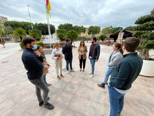 La portavoz del PP en Murcia, Rebeca Pérez, acompañada por representantes de Nuevas Generaciones, encabezados por su presidente, Antonio Landáburu, ha reivindicado la necesidad y la utilidad para los jóvenes del municipio que tiene la vuelta a la actividad del Búho Bus.