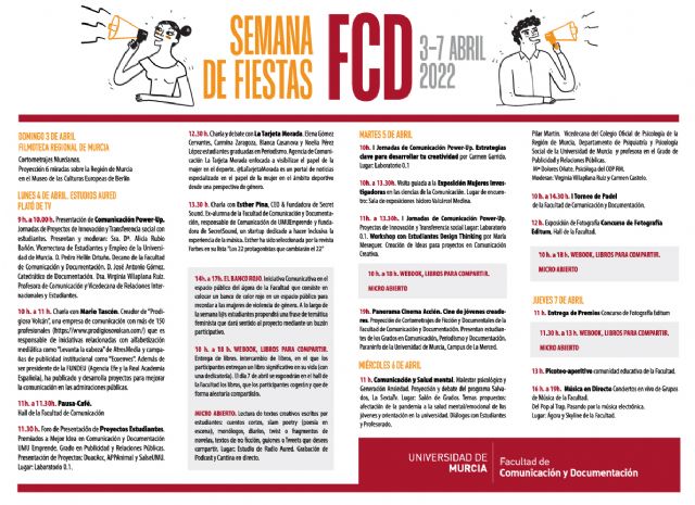 La Facultad de Comunicación y Documentación tendrá actividades lúcidas, culturales y formativas a lo largo de toda la semana con motivo de las fiestas. Habrá sesiones de micro abierto para que el alumnado tenga un espacio para dar a conocer sus creaciones y se proyectarán creaciones audiovisuales realizadas por estudiantes, entre otras cosas.
