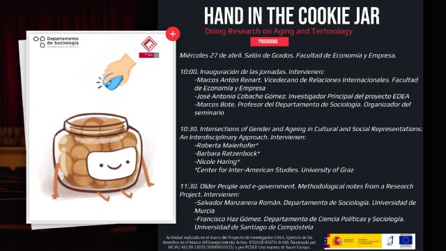 La Facultad de Economía y Empresa de la Universidad de Murcia celebra el próximo miércoles, 27 de abril, el seminario de investigación Hand in the cookie jar: Investigando las tecnologías y el envejecimiento, donde se presentarán las implicaciones de investigar el uso de la tecnología y la digitalización por parte de las personas mayores. El seminario se enmarca dentro del proyecto de investigación EDEA, Ejercicio de los Derechos en el Marco del Envejecimiento Activo, financiado con fondos FEDER, el Ministerio de Ciencia, Innovación y Universidades y la Agencia Estatal de Investigación. Este evento contará con la participación, entre otros, de la profesora Roberta Maierhofer, directora del Center for Inter-American Studies y una de las mayores expertas a nivel mundial en los estudios sobre envejecimiento, siendo especialmente relevante su aproximación teórica al género y el envejecimiento (Anocriticismo). El seminario dará comienzo a las 10.00 horas en el Salón de Actos de la Facultad de Economía y Empresa.