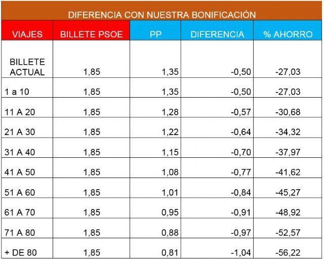 De hecho, con el planteamiento del PP el billete ordinario puede bajar hasta los 0,81 euros (rebaja de más del 56%) para los viajeros que se puedan beneficiar del 40% de descuento que recogen las bonificaciones que plantea el proyecto de los populares.