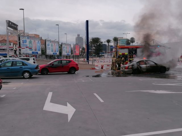 Servicios de emergencias sofocan el incendio de un vehículo en el aparcamiento de un centro comercial en Murcia