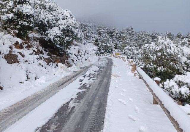 Cortan a causa de la nieve la carretera Collado Bermejo, dirección Pozos de la Nieve, en Totana