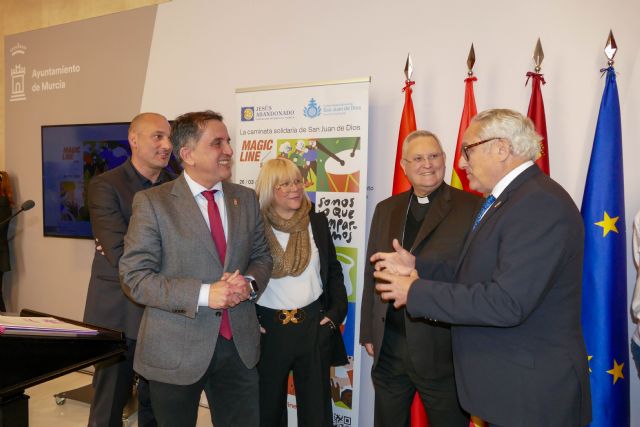 El Alcalde José Antonio Serrano, acompañado por José Manuel Martínez, presidente de la Fundación Jesús Abandonado; Álvaro Castillejo, responsable de Magic Line, José Manuel Lorca, Obispo de la Diócesis de Cartagena, y los concejales Pedro García Rex y Ainhoa Sánchez, han presentado hoy la Magic Line, una caminata solidaria que llegará en su primera edición en Murcia a través de la Fundación Jesús Abandonado.
