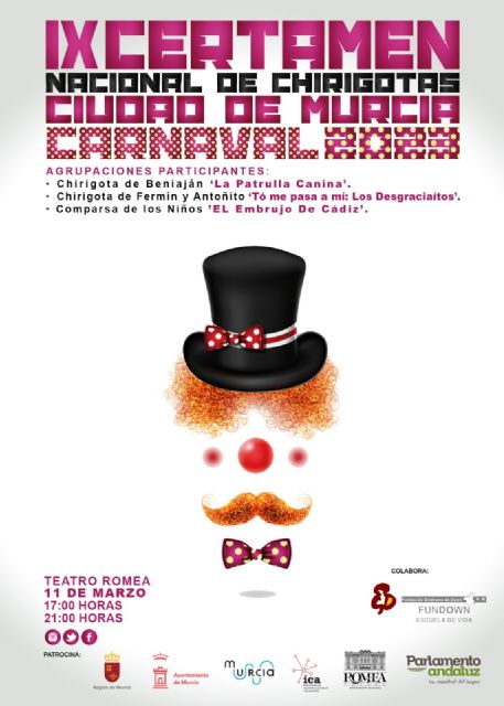 La Región celebrará este fin de semana la IX edición del Certamen Nacional de Chirigotas Ciudad de Murcia, con un evento en el que no faltará la música y el baile. Durante el encuentro, se hará entrega del 'Pito Solidario', una distinción que este año recaerá en la Fundación Síndrome de Down de la Región de Murcia.