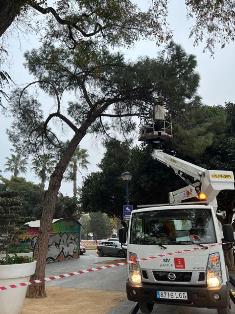 El Ayuntamiento de Murcia, a través del Servicio de Parques y Jardines de la Concejalía de Pedanías y Barrios, Recursos Humanos y Desarrollado Urbano, dirigida por Ainhoa Sánchez, junto a la empresa STV Actúa, está llevando a cabo la revisión del arbolado de gran porte para dejarlo a punto de cara a la Semana Santa y las Fiestas de Primavera.