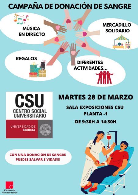 La Universidad de Murcia celebra este martes una jornada de donación de sangre en el Centro Social Universitario, espacio que durante toda la mañana será centro de actividades y de un mercadillo solidario con productos artesanos. Personal del Centro Regional de Hemodonación estará toda la mañana, desde las 9.30 hasta las 14.30 h. en la sala de exposiciones del CSU para recibir a estudiantes y personal que quieran donar su sangre. Con esta jornada se cierra la campaña de hemodonación que a lo largo de los últimos meses se ha desarrollado en diferentes centros y facultades de la Universidad de Murcia.