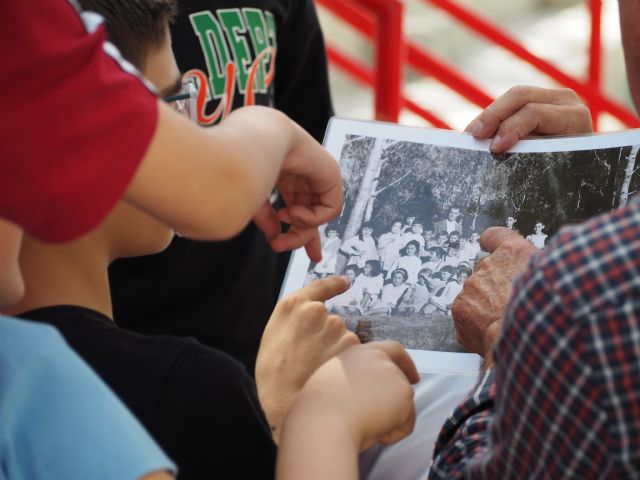 Otro grupo de personas del taller de patrimonio fue el que brindó un espacio para la conversación y el aprendizaje intergeneracional, llamado "A la fresca" y con la tradición oral como protagonista, relatando al alumnado algunos cuentos y enseñándoles canciones de su infancia; también llevaron algunas fotografías de sus tiempos de escuela, para compartirlas y hablar de los cambios que se detectan en ellas respecto a los grupos escolares de hoy en día.