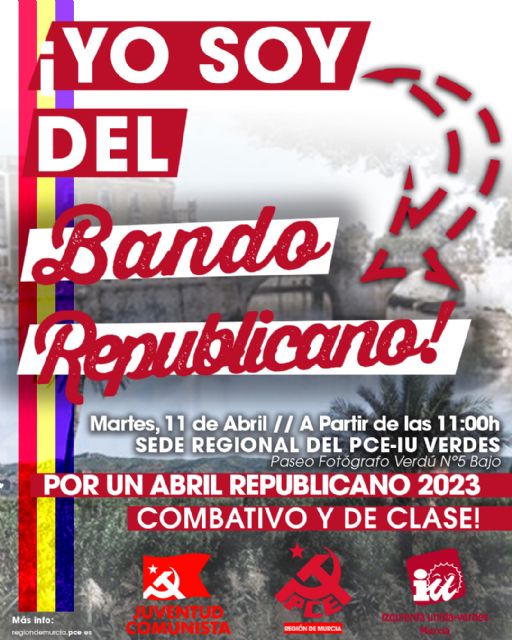 El martes 11 de abril coincidiendo con la fecha del Bando de la Huerta en Murcia; y como se vienen realizando estos últimos años, el Partido Comunista de la Región de Murcia, junto a la Juventud Comunista e IU-Verdes Murcia organiza el 'Bando republicano'. Desde las 11:00h, en la sede regional (Paseo Fotógrafo Verdú nº 5) para reivindicar un abril republicano, combativo y de clase. Un punto de encuentro de la militancia para celebrar el carácter festivo del día, así como reivindicar las tradiciones del pueblo murciano, su huerta y sus valores.