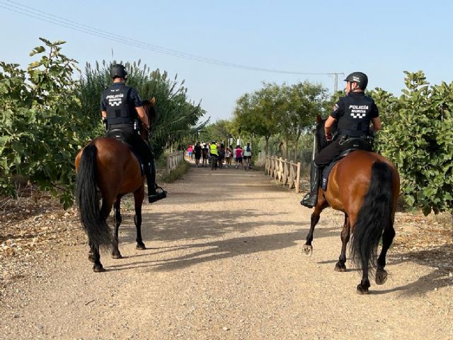 La Unidad Especial de Caballería de la Policía Local de Murcia ha iniciado sus rutas por las pedanías del municipio. Con motivo de las fiestas patronales de Torreagüera, los agentes han acompañado a decenas de ciudadanos que han participado en una marcha ciclo-turística por la vía verde que une las pedanías de Torreagüera, Los Ramos, Zeneta, Beniaján y Los Dolores.