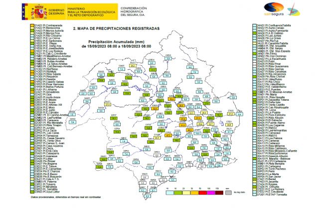 Otros valores reseñables por el visor SAIH son los de Gebas con 47,3 l/m2 (Alhama de Murcia) o los 41,4 l/m2 acumulados en embalse de Los Rodeos (Campos del Río). También destacar los 24,8 en el embalse de La Pedrera (Alicante) o los 27 en el canal del Alto Taibilla (Albacete). La jornada de mayor intensidad aconteció entre el viernes y el sábado.