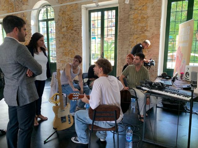 El concejal de Cultura e Identidad del Ayuntamiento de Murcia, Diego Avilés, y la concejala de Talento Joven y Espacios Públicos, Sofía López-Briones, han visitado este miércoles el Big Up! Song Writing Camp que se está celebrando en el pabellón 1 del Cuartel de Artillería.