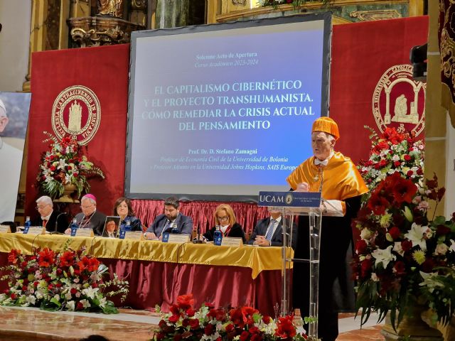 La jornada daba inicio con la celebración de la Eucaristía, presidida por José Manuel Lorca Planes, obispo de la Diócesis de Cartagena. A continuación, se ha desarrollado el Acto Académico, presidido por María Dolores García Mascarell, acompañada por Josefina García Lozano, rectora de la institución; Fernando López Miras, presidente de la Comunidad Autónoma de la Región de Murcia; Juan María Vázquez, consejero de Medio Ambiente, Universidades, Investigación y Mar Menor; Antonio Montoro, rector honorario y José Manuel Lorca Planes. Stefano Zamagni, profesor de Economía Civil de la Universidad de Bolonia y profesor adjunto de la Universidad Johns Hopkins (SAIS Europa) ha impartido la Lección Inaugural.