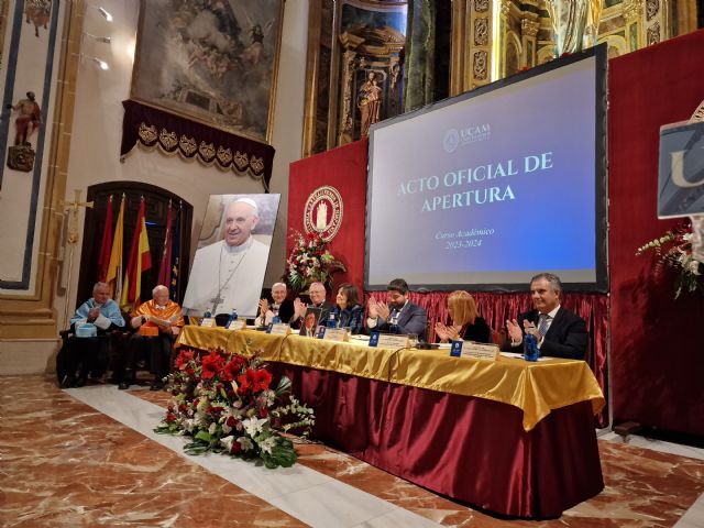 María Dolores García, presidenta de la UCAM, ha tenido muy presente al fundador de la Universidad Católica de Murcia en su discurso del Solemne Acto de Apertura del Curso Académico 2023-2024, en el que se han superado los 23.000 alumnos