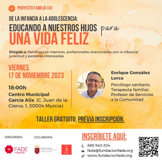Todas las herramientas que aportan los profesionales son bienvenidas a la hora de tener recursos con los que educar a niños y adolescentes, ya que en muchas ocasiones las familias se enfrentan a situaciones que les desbordan y no saben cómo encauzar. Para facilitar esta labor, el Centro Municipal García Alix acoge este viernes, 17 de noviembre, un encuentro titulado ‘De la infancia a la adolescencia: educando a nuestros hijos para una vida feliz’, una sesión organizada por FADE (Fundación de Ayuda Desarrollo y Educación) que arrancará a las 18.00 horas.