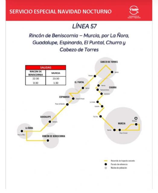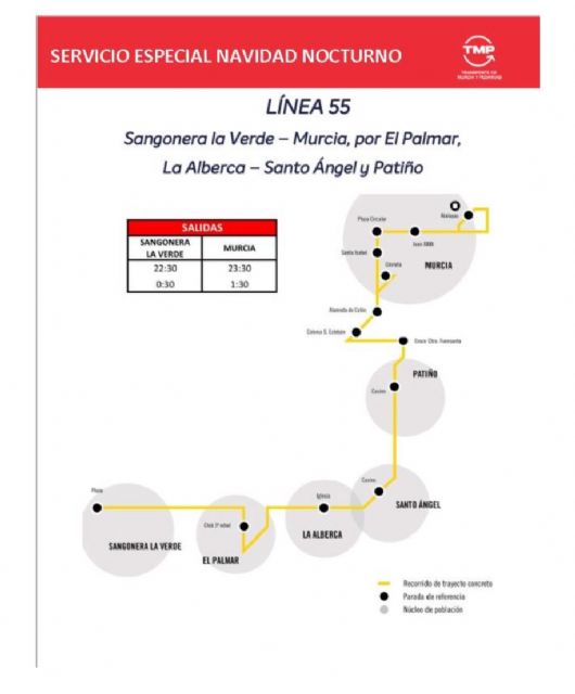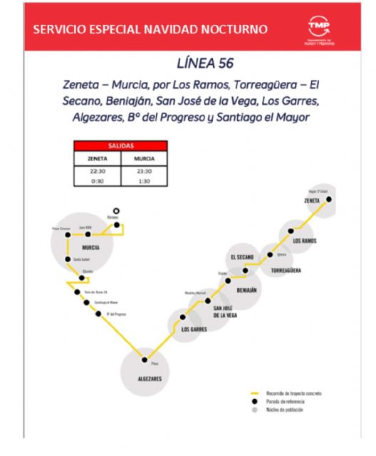 Seis líneas, distintas a las regulares, comenzarán a operar mañana por la noche, con salidas desde Sangonera la Verde, Zeneta, Rincón de Beniscornia, Sangonera la Seca, Alquerías y Cobatillas, a partir de las 22:30; la siguiente expedición saldrá a las 0:30