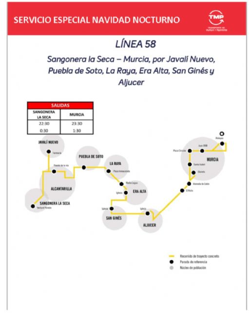 En lo referente a la línea 58, cubrirá el trayecto existente entre Sangonera la Seca y Murcia, por lo que prestará servicio a Javalí Nuevo, Puebla de Soto, La Raya, Era Alta, San Ginés y Aljucer.
