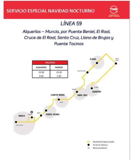 Las pedanías de Murcia tendrán un nuevo servicio nocturno de autobús los fines de semana de Navidad sin coste para los usuarios. El Servicio Municipal de Transportes, dependiente de la Concejalía de Movilidad, que dirige el edil José Francisco Muñoz, ha planificado, coordinado y diseñado, junto a la empresa concesionaria, 6 líneas, distintas a las regulares, que comenzarán a operar mañana viernes, con salidas a las 22:30 horas desde Sangonera la Verde, Zeneta, Rincón de Beniscornia, Sangonera la Seca, Alquerías y Cobatillas.
