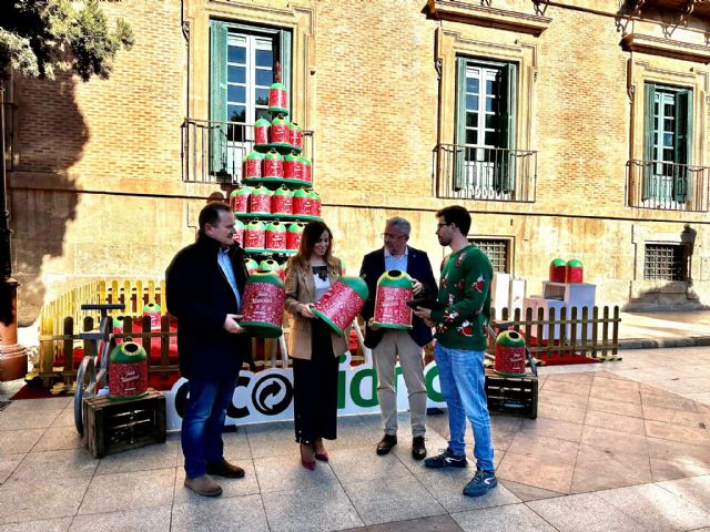 El Ayuntamiento de Murcia, por medio de la Concejalía de Fomento y Patrimonio, que dirige la vicealcaldesa Rebeca Pérez, y Ecovidrio han instalado un árbol de Navidad sostenible de 4 metros de altura que anima a los murcianos a practicar el reciclaje de vidrio durante este fin de semana.