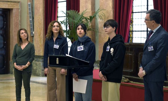 El alcalde de Murcia, José Ballesta, ha recibido hoy, en el Salón de Plenos del Ayuntamiento, a los 70 alumnos de 4º de la ESO del Instituto Ramón y Cajal que han participado en la VI Marcha por la Igualdad. Los estudiantes han leído un manifiesto en el que han destacado la importancia de la igualdad entre hombres y mujeres para afianzar el avance social. Los estudiantes Mencía Navarro y Joseph Nicolás Mendivelso han puesto voz al manifiesto. De igual manera, los alumnos también han elaborado una pancarta conmemorativa.