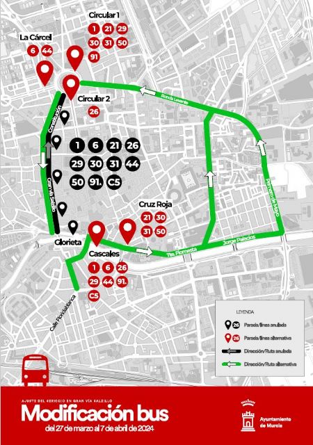 Para facilitar el montaje de tribunas en la Gran Vía de Murcia y para que los desfiles se puedan desarrollar sin ningún problema, también se han planificado desvíos alternativos del transporte público como consecuencia del corte del carril bus desde Martínez Tornel a la Plaza Circular desde este 26 de marzo y hasta el próximo 7 de abril.
