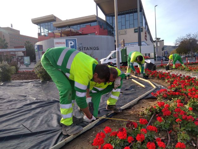 Más de 2.000 geranios, yucas y pequeñas palmeras llenan de vida la isleta de entrada al Hospital Virgen de la Arrixaca