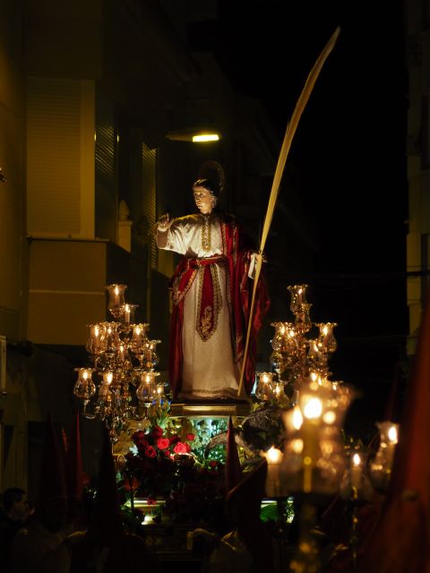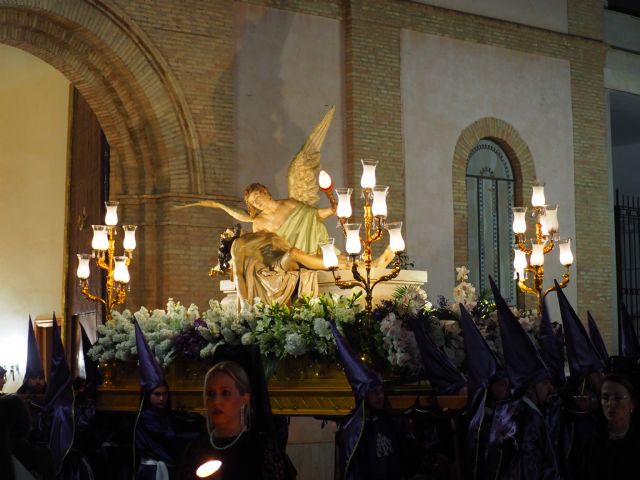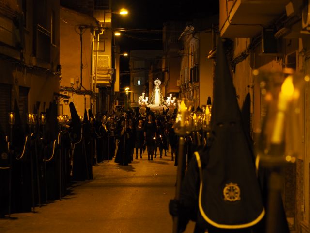 Al regio paso del Cristo de las Penas, sumido en el tronar de los tambores, siguió el célebre Santo Sepulcro beniajanense, en el que yace el Señor de la Buena Muerte que tallara el escultor local José Ortiz. Después, San Juan Evangelista con sus penitentes de encendidas capas rojas. Y cerrando, como reina del Viernes Santo, Ntra. Sra. de la Soledad envuelta por las marchas interpretadas por la Agrupación Musical de Beniaján. La tregua otorgada por la lluvia de estos días se tornó en copiosa petalada, precisamente, sobre el trono de la Virgen a su paso por las llamadas Cuatro Esquinas. Emoción a flor de piel.