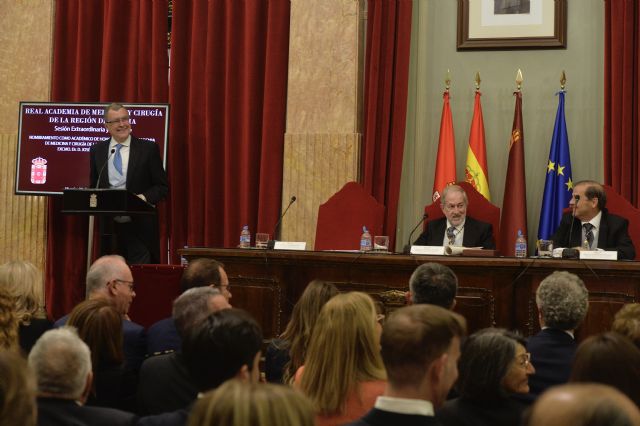 Al acto, celebrado durante la tarde de este jueves en un Salón de Plenos abarrotado, han asistido, entre otras autoridades, el presidente de la Real Academia de Medicina y Cirugía de la Región de Murcia, Manuel Segovia; los consejeros de Medio Ambiente, Universidad, Investigación y Mar Menor, Juan María Vázquez, y de Salud, Juan José Pedreño. Así como José Luján, rector de la Universidad de Murcia; miembros de la Corporación Municipal; académicos de número y correspondientes de la institución, los presidentes de las Academias de Legislación y Jurisprudencia, Veterinaria y Ciencias; presidentes y decano de los Colegios Oficiales de Abogados, Dentistas y Farmacéuticos; directores generales; directores del FFIS y del IMIB y los presidentes de Hefame, Fundación Cajamurcia, Proyecto Hombre.
